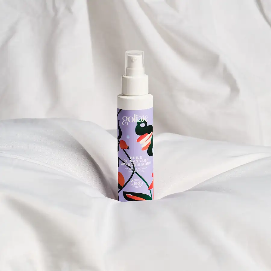 Що може бути краще, ніж досліджувати тіла одне одного з ароматною та теплою масажною олією? Пропонуємо купити масажну олію Goliate Huile De Massage Aphrodisiaque — на 100 % органічну, у складі якої міститься натуральна олія сандалового дерева: вона не тільки глибоко доглядає за шкірою, але й діє як натуральний афродизіак, пробуджуючи чуттєвість і сексуальну енергію. Екстракт кореня імбиру надає розігрівальну дію, а ефірна олія бергамоту знімає напруження і дає розслаблювальний ефект. Олія повністю натуральна та веган-френдлі, не містить хімічних запашників, сертифікована Ecocert Greenlife відповідно до стандарту COSMOS.