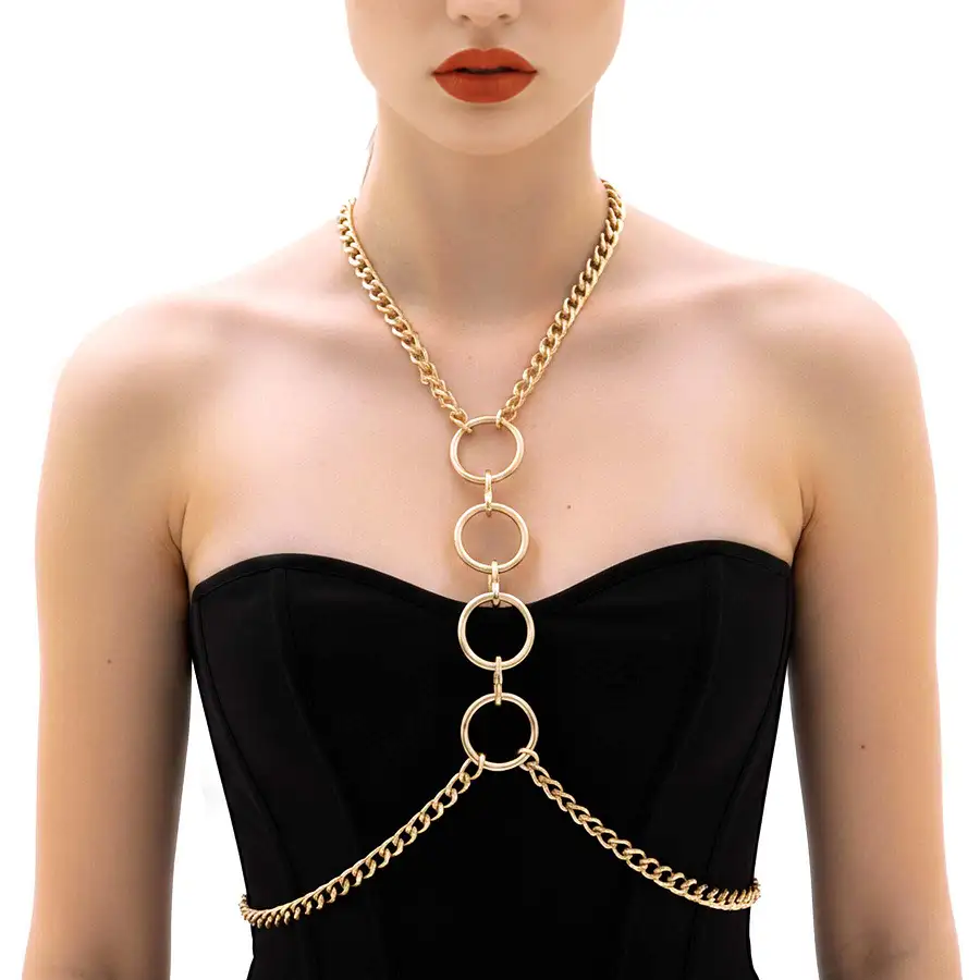 Конструкція м’яко лягає по контуру, обрамляючи зону декольте та акцентуючи талію. Центральні кільця підсилюють драматичність образу й додають нотку домінування. У русі ланцюги красиво перегукуються з тілом, створюючи гру світла та притягальну динаміку.
