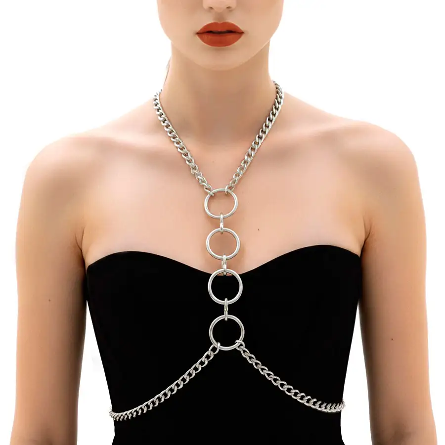 Конструкція м’яко лягає по контуру, обрамляючи зону декольте та акцентуючи талію. Центральні кільця підсилюють драматичність образу й додають нотку домінування. У русі ланцюги красиво перегукуються з тілом, створюючи гру світла та притягальну динаміку.