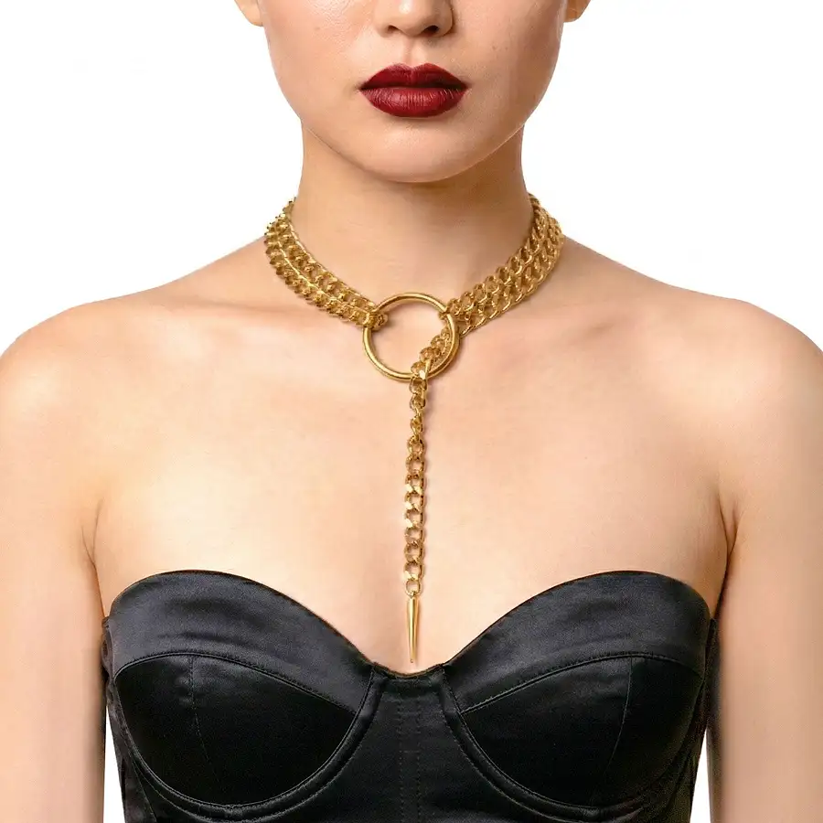 Ефектна прикраса з масивним ланцюгом і центральним кільцем створює сильний акцент і привертає увагу з першого погляду. Довга підвіска візуально витягує силует і підкреслює лінію декольте.