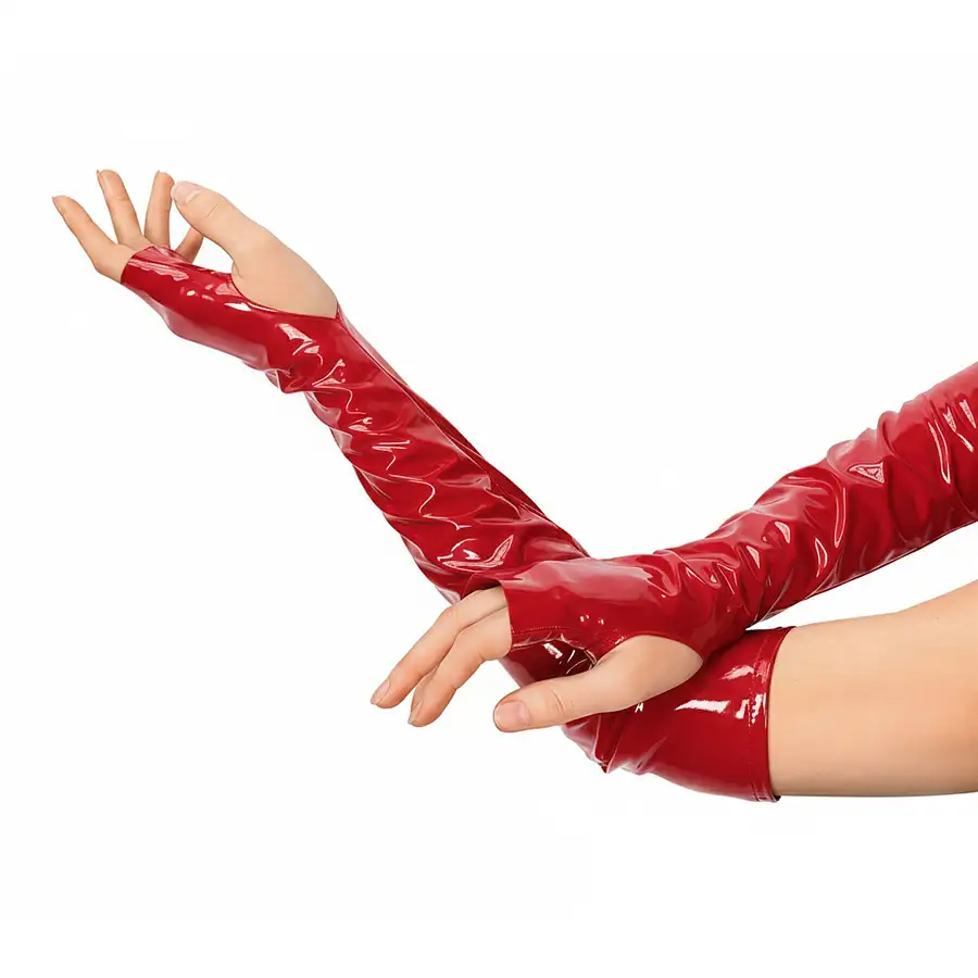 Ці вінілові мітенки — чистий характер. Довгі, глянцеві, з відкритими пальцями — вони візуально подовжують силует рук і додають образу хижої впевненості. Щільний вініл красиво облягає шкіру, створюючи ефект другої шкіри з дзеркальним блиском.