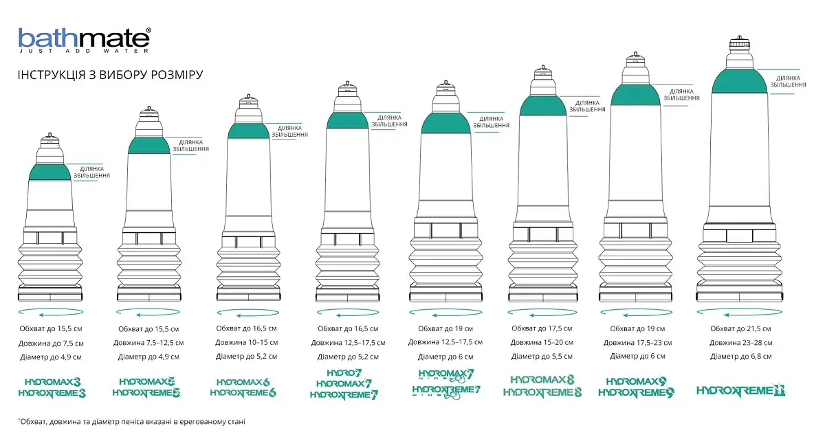 Примітка: Bathmate HydroXtreme 8 екстремально потужний проти звичайних помп, тому необхідно проявляти обережність під час його використання. Прилад розроблений для більш просунутих користувачів. Для початківців рекомендуємо створювати тиск повільно і збільшувати навантаження поступово. Підходить для члена довжиною від 15 до 20 см, діаметр до 5,5 см.