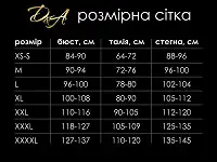 ВАЖЛИВО! Звертаємо вашу увагу, що розмірна сітка лакованої білизни D&A показує, на які заміри підійде виріб, а НЕ його фактичні заміри. Лакована білизна має щільно сідати на тіло, щоб досягти потрібного обтислого ефекту.